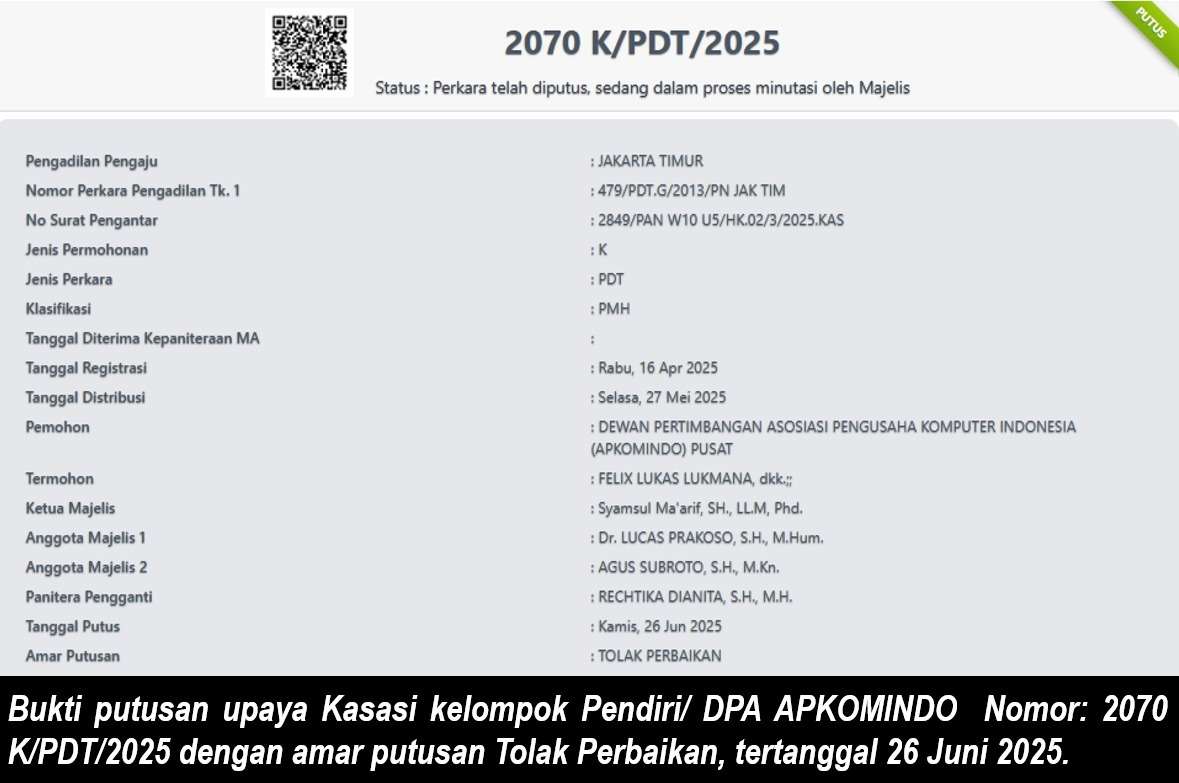 “Dengan demikian, pihak kelompok pendiri APKOMINDO telah dua kali mengalami penolakan upaya kasasi dalam prahara perkara perdata APKOMINDO di MA,” ungkap Hoky dalam keterangan tertulisnya, Senin (30/06/2025)..