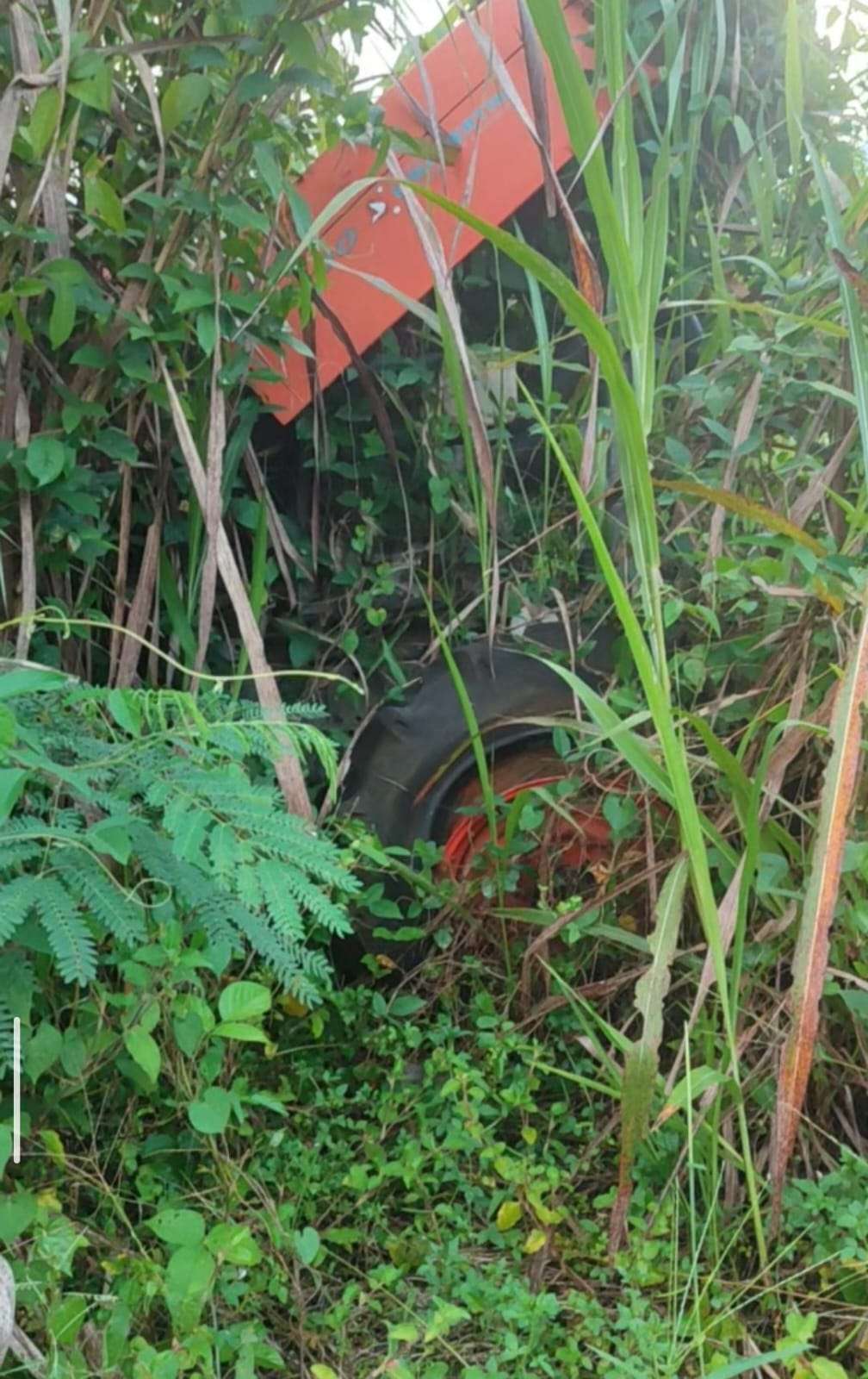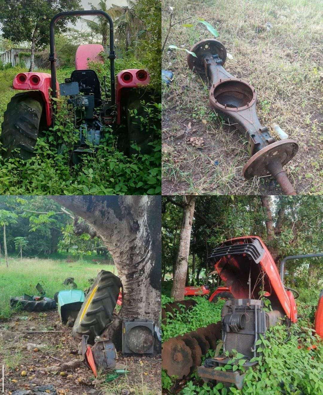 Mirisnya, alsintan ini sudah dalam keadaan tidak utuh karena dipreteli, bahkan terlihat ban traktor dan bagian alat mesin yang berceceran.