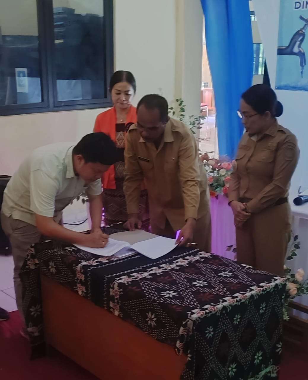 Pejabat Pembuat Komitmen yang juga Kepala Bidang Cipta Karya Dinas PUPR Kabupaten SBD, Hironimus Mete, SST sedang menandatangani kontrak. ( Foto Menara Sumba )