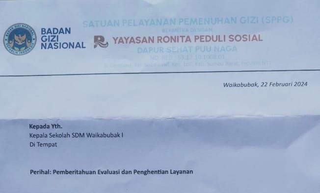 Surat itu berbunyi, selaku vendor, Dapur Sehat Puu Naga berterima kasih kepada pihak SDM Waikabubak I atas kerja sama dan kepercayaan yang telah diberikan dalam penyediaan makanan bergizi bagi siswa-siswi.