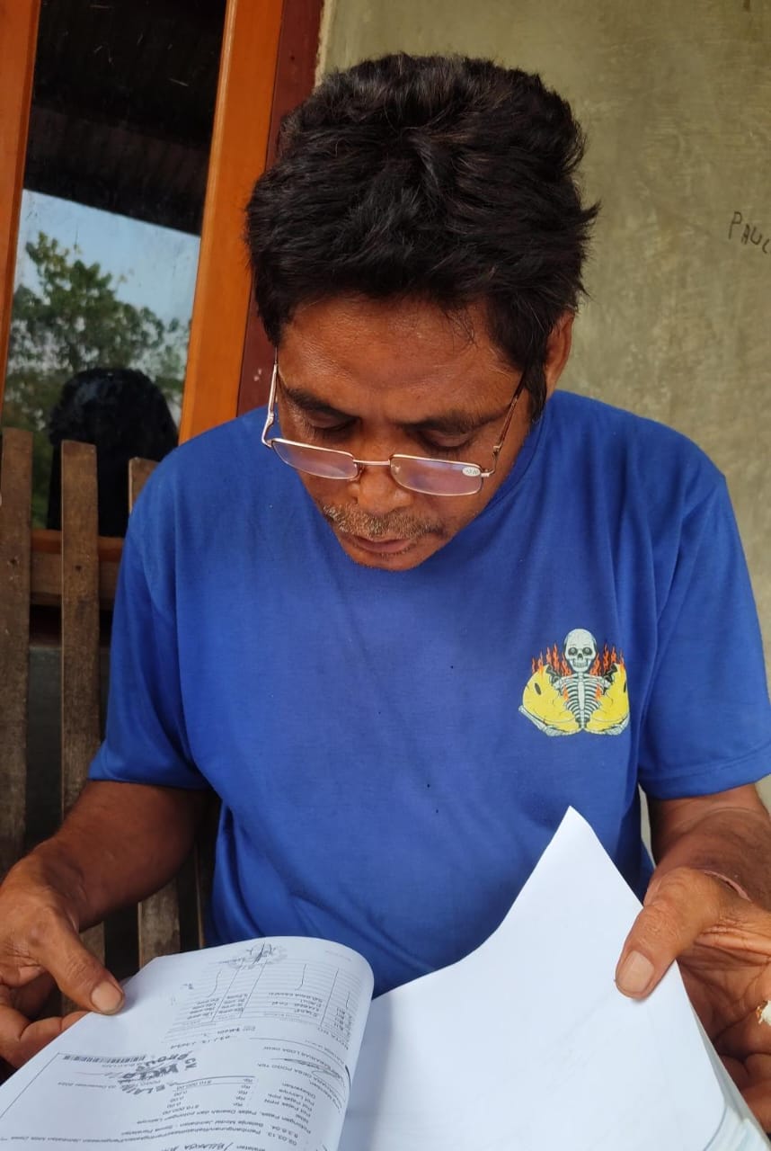 Wakil Ketua BPD Pogo Tena, Adrianus B. Tako sedang memperlihatkan bukti pertanggungjawaban pengelolaan APBDesa Tahun 2024. ( Foto Menara Sumba )