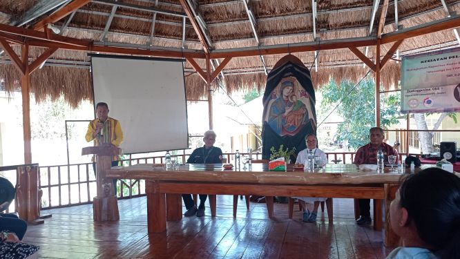 Pimpinan LBH Sarnelli, P. Paulus Dwiyaminarta, CSsR sedang membawakan materi pada hari pertama pelaksanaan pelatihan paralegal, Kamis (05/10/2023). ( Foto Menara Sumba )