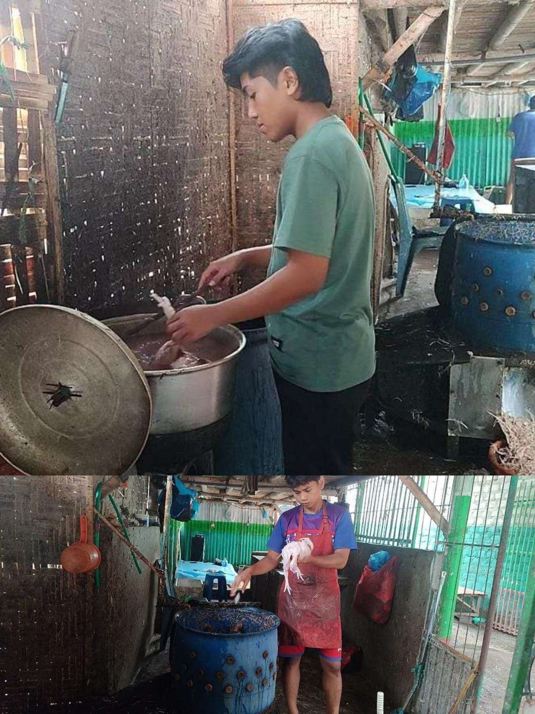 Sambil mencelupkan ayam yang sudah disembelih ke dalam dandang air panas, ia sebut jika itu adalah bonus bagi yang membeli ayam pedaging di situ.