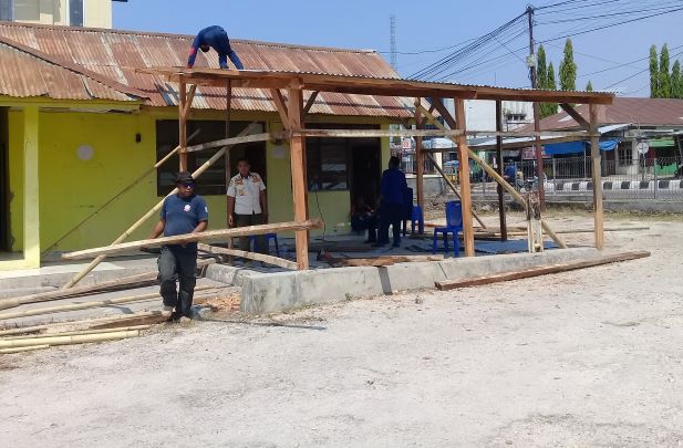Pantauan media ini pada siang itu terlihat kesibukan lima personil dinas termasuk sang kadis yang sedang membangun sebuah ruangan darurat berbilik dinding.