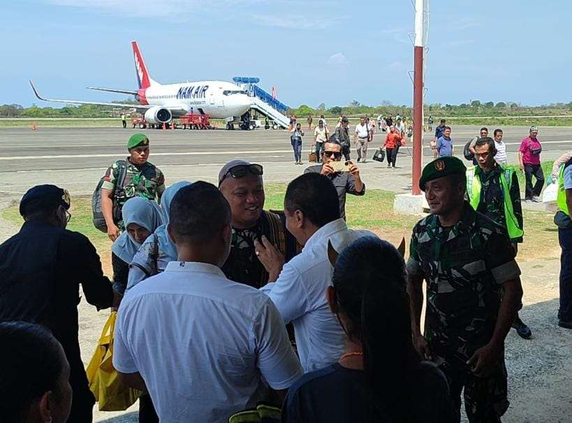Di pintu ruang kedatangan Bandara Lede Kalumbang, Dandim diselempangkan kain oleh Chris Wungo salah satu tokoh SBD disusul Wakil Ketua DPRD SBD, Yusuf Bora serta sejumlah pejabat lain.