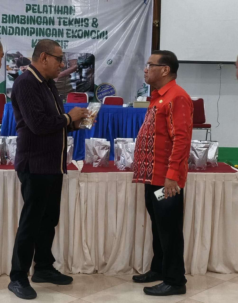 Kepala Dinas Pariwisata dan Ekonomi Kreatif Provinsi NTT, Noldi Hosea Pelokilla, S.Sos, M.M (kiri) bersama Asisten Bidang Pemerintahan dan Kesejahteraan Rakyat Setda Kabupaten SBD, Christofel Horo, SH (kanan) sedang melihat produk UMKM peserta pelatihan.