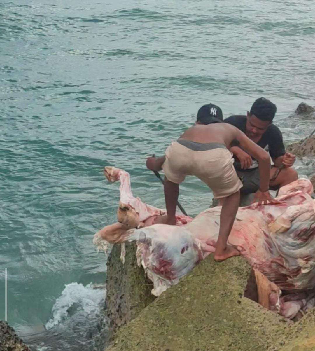 Beberapa ekor yang terdampar di Pelabuhan ASDP Waikelo dikuliti dan diambil dagingnya oleh warga.