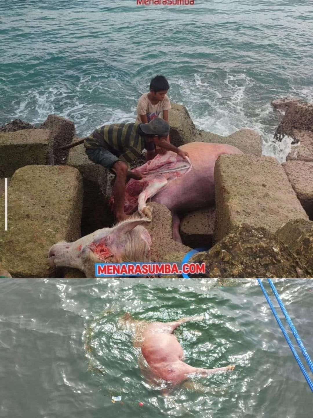 TAMBOLAKA, MENARASUMBA.COM – Beberapa bangkai kerbau ditemukan mengapung di perairan Pelabuhan Waikelo, Sumba Barat Daya, NTT.